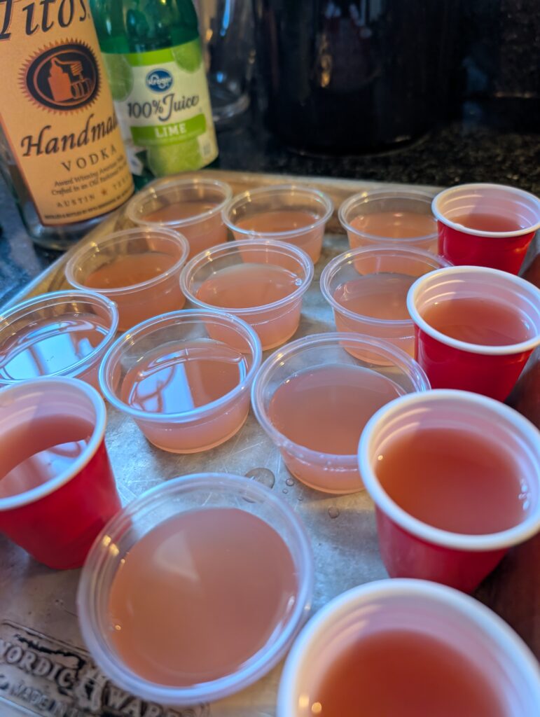 Cut into desired shapes to serve. (I poured them into tiny disposable cups for travel-friendliness). Makes 12 to 18 jelly shots.